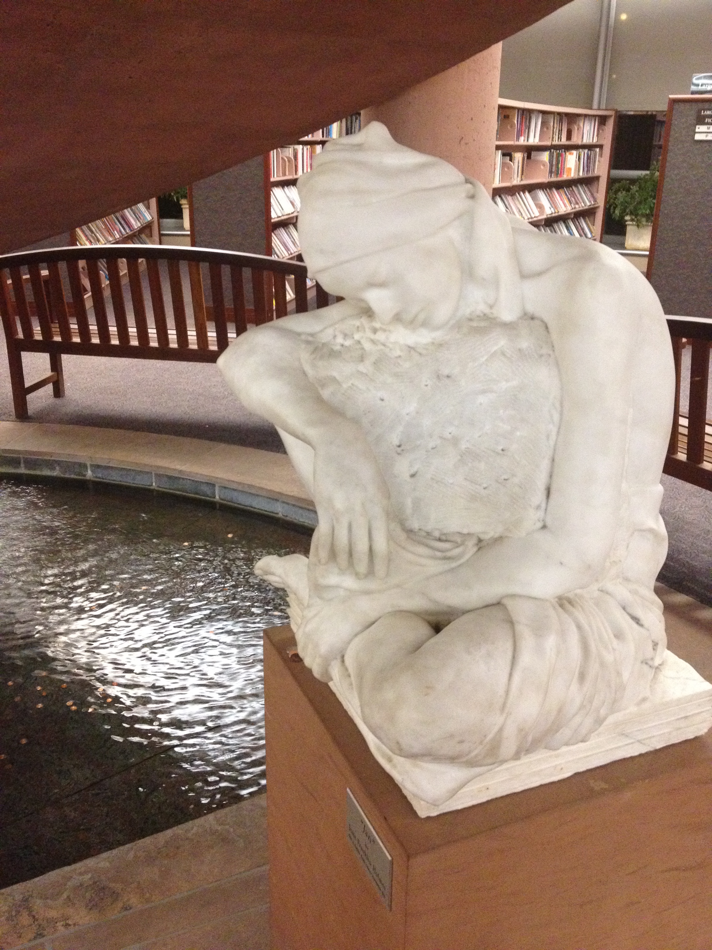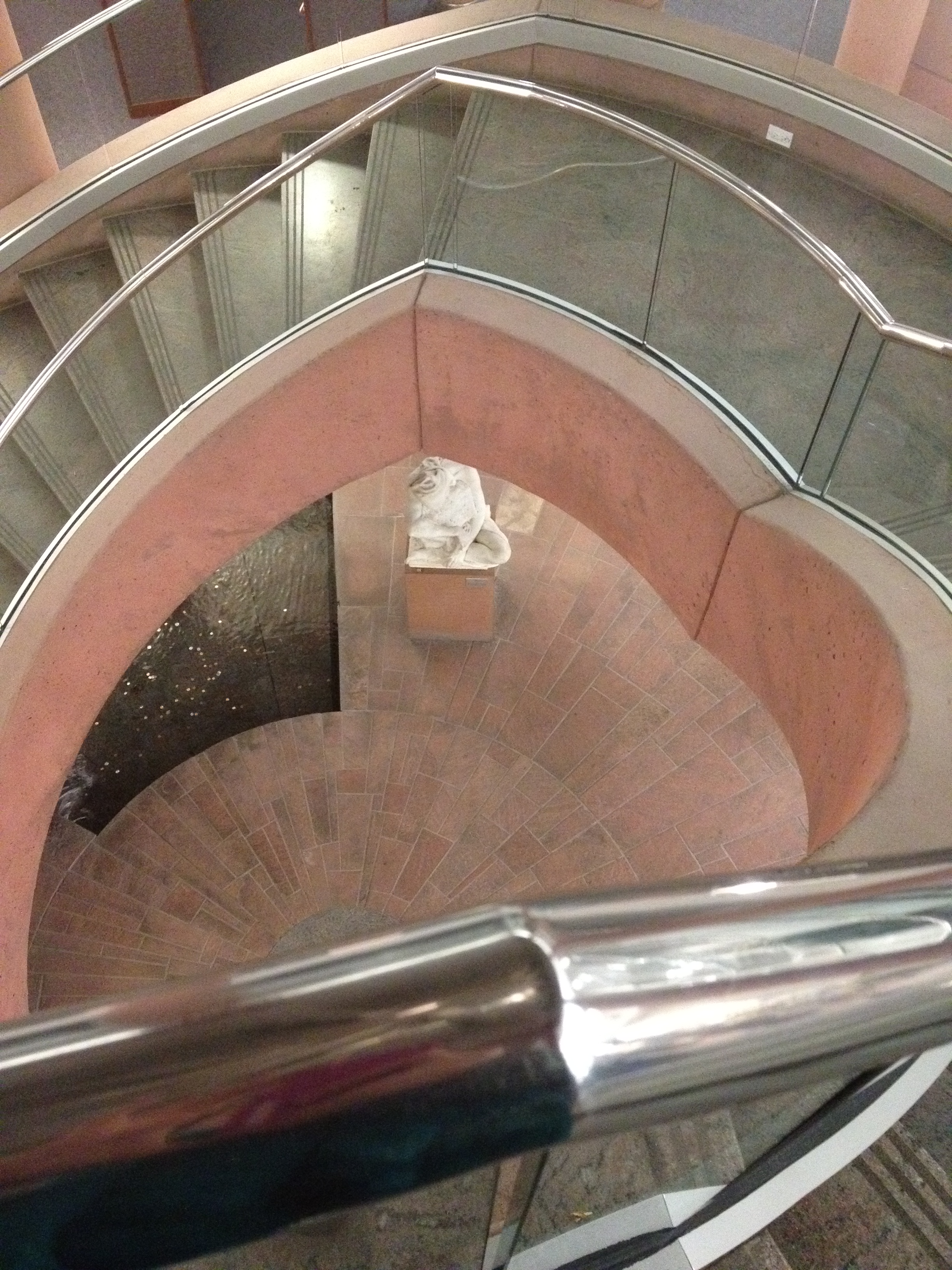 She is hidden there–under the stairs– a beauty in white marble lulled to sleep by the water flowing next to her. She is the keeper of wishes and the goddess of the wishing well. The coins sparkle under ripples. She is warmed with pink stone, and if you choose to sit with her, it will be at a respectful distance, back to back.